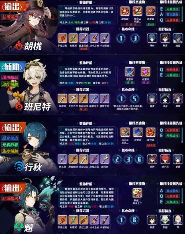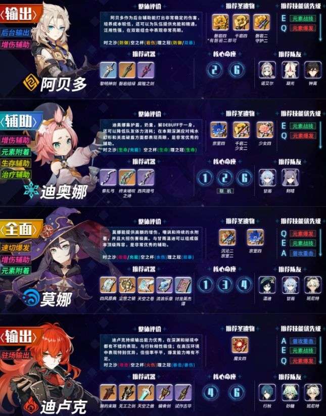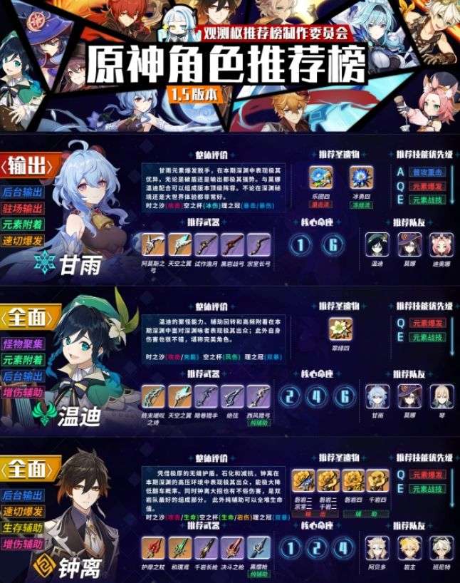 需要说明的是,本榜单仅针对深境螺旋。不是以深境螺旋为目的而养成的玩家可以任意选择自己喜欢的角色培养,所有角色的配装也都是经过斟酌决定的。