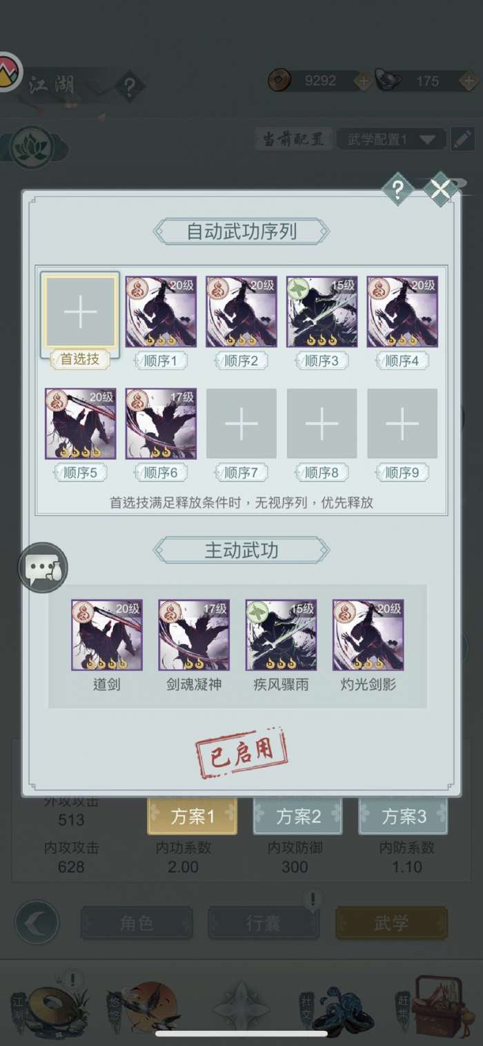 但因为自动并不能像手动一样打出满伤害,而且自动武功的情况下想要一套打满道剑,对剑意要求过高。因为自动武功的情况下只允许两次灼灼灼+道剑+剑魂,两次灼灼灼+弱水+剑魂。而且这套连招特别看脸,如果灼灼灼触发几率较低,很难在道剑和弱水后打出满层若水剑魂。所以我舍弃弱水。