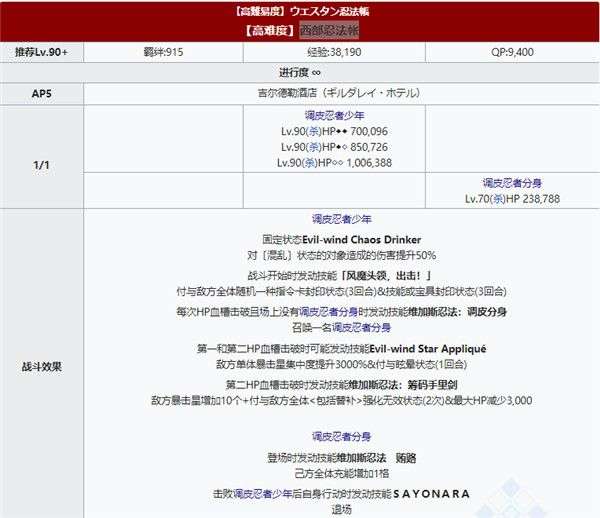 且在攻略过程中其还会召唤分身,分身持有同款宝具效果,小太郎技能自带降低我方攻击的debuff,同时自己还有闪避效果,其还会晕眩我方,第二条血量击破后还会给全体(包括后排)附加强化无效效果,总而言之就是断绝玩家想要快速爆破思路的同时,还用各种机制腻歪玩家。