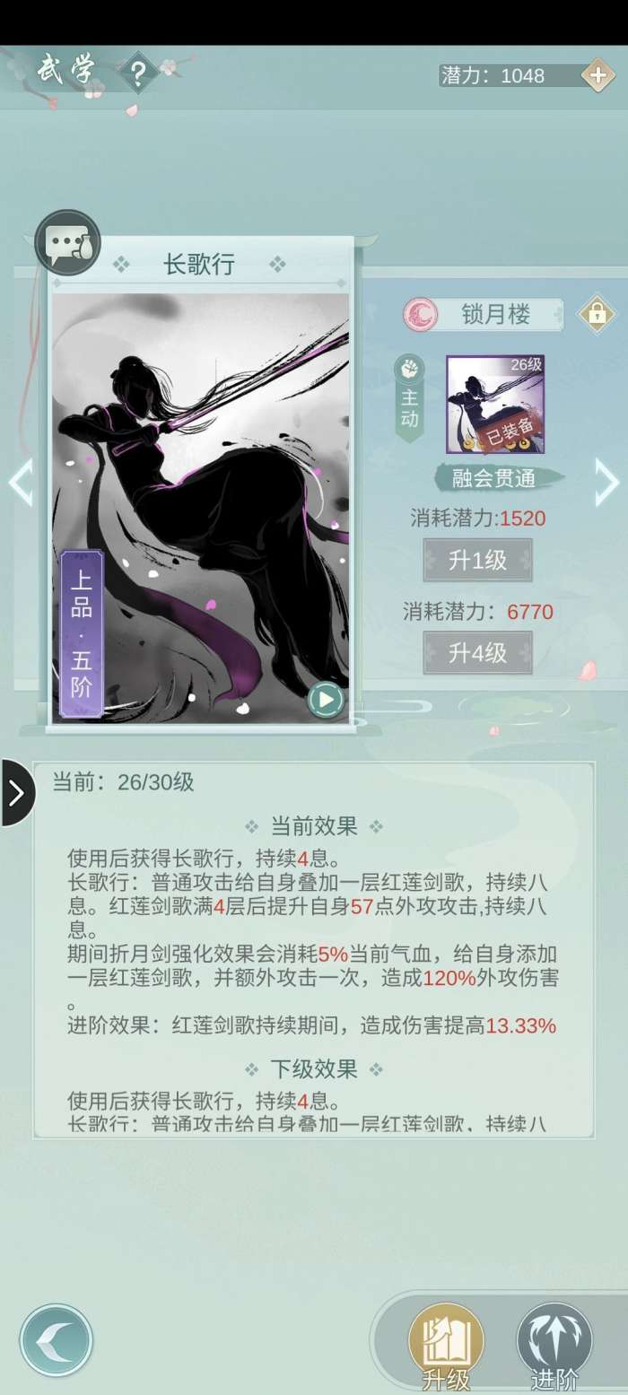 开局长歌行——秒放折月剑(打出折月剑的强化效果)添加两层长歌行被动红莲剑歌———对手行动条走过一半后,释放折月剑第二段折月返增加两层红莲剑歌———释放强化后的飞影逐月。