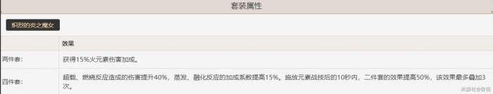 常规的火角色通用套,需注意四件套只能叠加一层,加成较低,但对打反应的旅行者也有着不错的提升。