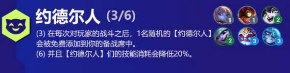 约德尔人:对局结束之后,会随机获得一个约德尔人的英雄,而且在6约德尔人之后,技能消耗也会降低20%。而且最重要的是,如果6个约德尔人全部三星,那每局比赛结束之后,都会获得一个邪恶小法师,而小法师作为一个五费卡英雄,在商城中是刷不出来的,三星的小法可以说是最强的五费卡了,一招清屏,视觉效果满分。