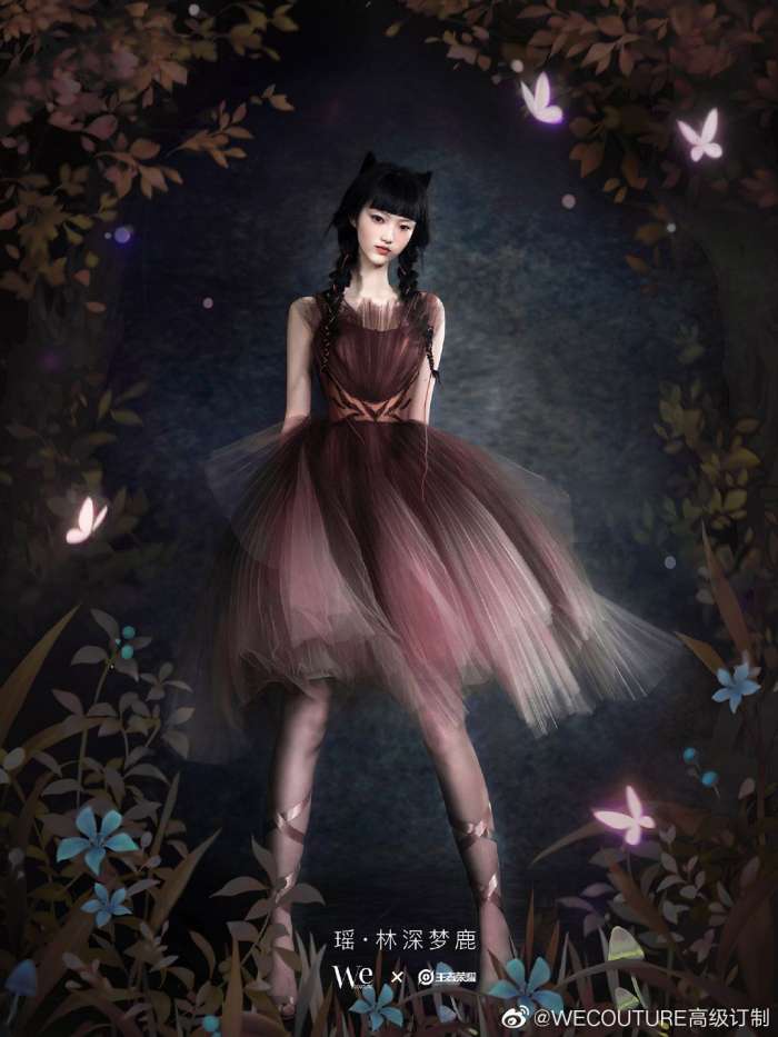 瑶-林深梦鹿款的订制价格28800。阿瑶的礼服采用意大利网纱进行喷绘工艺,呈现渐变晕染的灵动效果,用法式钩针将珠料凝作鹿角,手工编织加以施华洛世奇水晶点缀勾勒出藤蔓的优美姿态,赋予阿瑶的仙气灵动于最真实的形态细节。