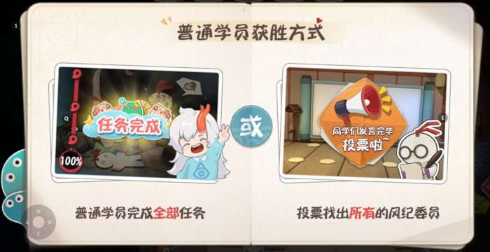 ①普通学员完成筹备任务,所有学员100%完成任务即可获胜;②通过讨论投票,揪出所有风纪委员即可获胜。