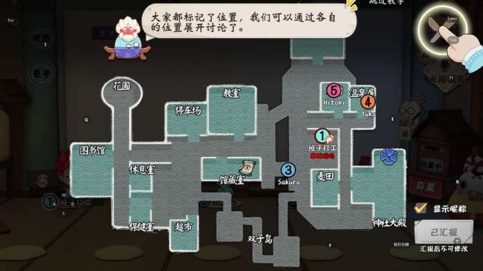 地图小技巧:玩家可以在神社大殿的八咫镜中,监控到停车路口、保健室外、宿舍外围和神社南门的部分情况哟!