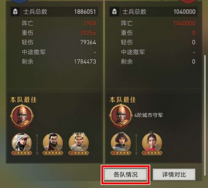 此类战报是最适合作为阵容和技能搭配的参考对象,我们点开最下方的【各队情况】选项,在这一场战斗中,所有参与领主的战损比都在此可见。