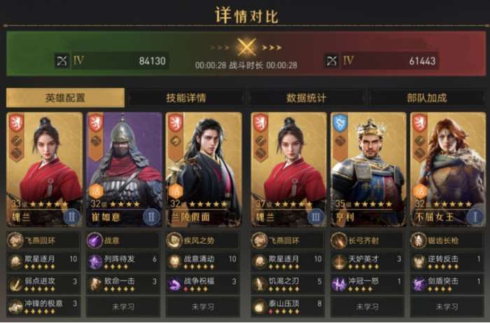 将战报拉至最下方,可以看到【详情对比】选项,点击进入后,首页是英雄配置,在此可以清楚了解对双方的阵容与装配的技能。