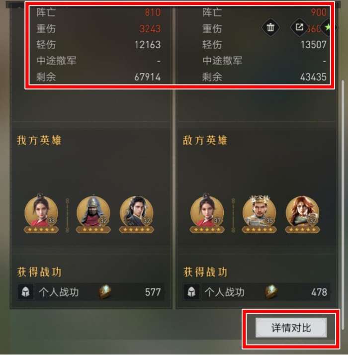除建筑耐久类战报外,其余所有战报的首页均为敌我战损对比,从这一项可以清楚的了解双方的实力比,用以衡量接下来的作战计划,敌强则避其锋芒,敌弱则乘胜追击。