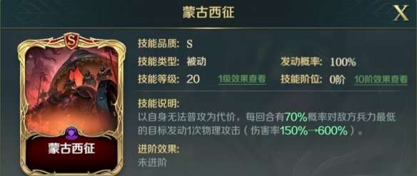 铁木真虽然不能普攻,但是其技能为被动,每回合70%概率造成600%物理伤害,发动概率很高,伤害倍率也很高,同时自带导航瞄准兵力最少目标,可以作为爆头队的辅助,携带楔型骑兵阵进行定点击杀,以及携带野蛮战吼或者渗透作战。
