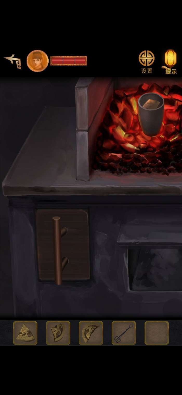 炉子左边捡一下烧火钳和布。左边小水盆,布沾湿然后擦中间石板上的灰。发现石板上的图案和右边盒子上有渊源。按石板上提示移动盒子上的棋子,打开盒子获得铜块。