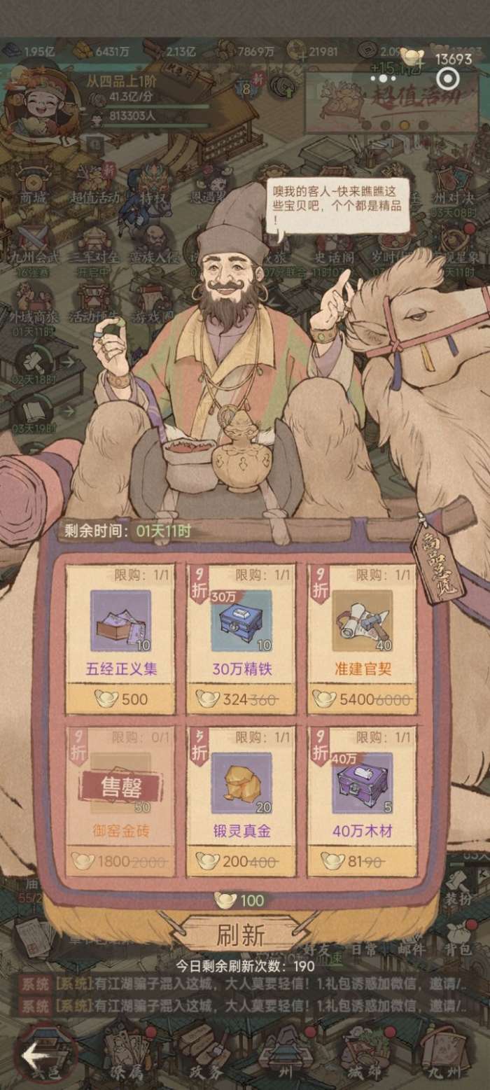 招贤通宝:8折以下可直接购买。僚属是平民和微氪最缺的。没办法每日18的情况下。招贤通宝显得格外的重要。囤够数量,在氪佬招贤的时候去截胡。如果没有达到3w的情况下,8折在最后2天都建议购买。