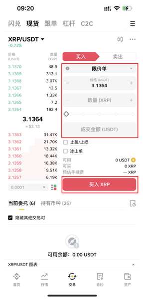 4、依次选择【限价单】-购买【价格】-购买【数量】-【成交数量】,设置好之后,点击【买入XRP】。
