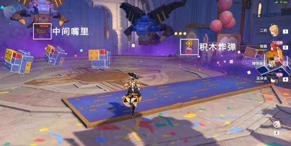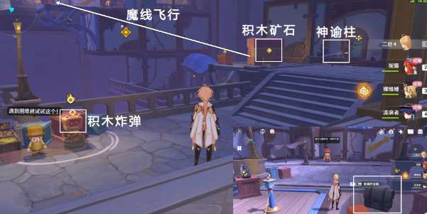 15、到达上面之后,首先拾取积木炸弹,安装于积木矿石上,拾取神谕柱,安装于底座上,最后直接飞过去就可以去上层。