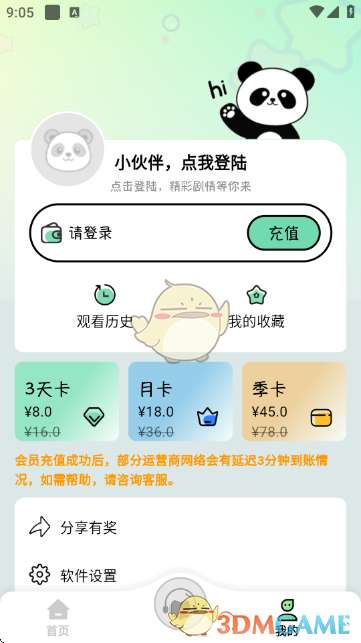 进入“我的”板块,可进行登录、充值会员(选择3天卡、月卡、季卡等)、查看观看历史、我的收藏,还可参与分享有奖活动、进行软件设置。