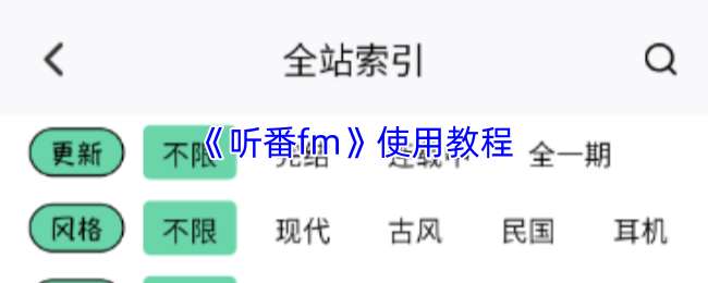 在“全站索引”界面,可通过更新状态、风格、性质、状态等条件筛选广播剧,精准找到符合需求的作品。
