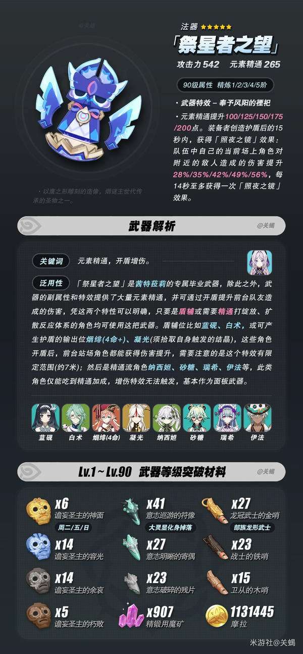 • 说明:「祭星者之望」是茜特菈莉的专属毕业武器,除此之外,武器的副属性和特效提供了大量元素精通,并可通过开盾提升前台队友造成的伤害,凭这两个特性可以明确,只要是盾辅或需要精通打绽放、扩散反应体系的角色均可使用这把武器;