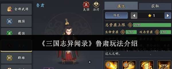 三国志异闻录鲁肃怎么玩?不少玩家在组建阵容时对鲁肃的定位和技能机制感到困惑,小编整理了关于三国志异闻录中鲁肃的详细解析。这位武将在实战中虽非输出核心,但凭借出色的生存能力和团队辅助价值,成为许多阵容中不可或缺的存在。尤其在面对控制流、异常状态压制流派时,鲁肃的表现尤为亮眼。下面我们一起来看看三国志异闻录鲁肃的具体玩法与技能运用。
