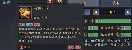 鲁肃的主动技能主要针对敌方前排单位,伤害数值与目标当前生命上限相关,具备一定的百分比伤害特性。释放后还能为自身回复少量生命值,提升其持续作战能力。技能有一定概率附加流血状态,使目标在后续受到持续伤害,并降低其受到的治疗效果。这一机制不仅削弱了敌方前排的生存能力,也为己方输出创造了更有利的输出环境。配合其他能叠加负面状态的角色,可进一步放大流血的压制效果。