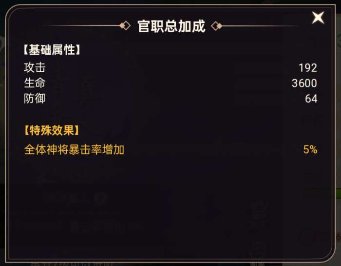 游戏内官职升级可获得全队加成属性,带来全队攻击、防御、生命提升;每次官阶提升更可获取游戏内的超稀有全队百分比加成属性,比如暴击率、抗击退效果等。