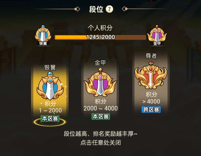 斗法分成银翼、金甲、尊者三个段位。每次挑战或复仇需要消耗1张入场券,挑战成功或失败将获得或损失一定积分,到达指定积分系统自动提升段位。段位越高、排名奖励越丰厚。