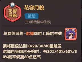 羁绊技能:和羁绊武将同时上阵时才会生效,且羁绊效果随着羁绊武将的星级数提升而提升。羁绊技能的效果可以发挥羁绊武将的长处或弥补其短板,就拿貂蝉来说,虽然被称为回怒型武将,但她却无法为自己回复怒气,而这次战魂技能就可以有效解决貂蝉的“自充能”问题。