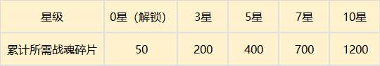 战魂升星:利用战魂碎片进行升星,可以提升战魂带来的属性收益和战魂的主战技能效果。下表是将战魂升到对应星级所需的战魂碎片详情。