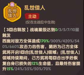 主战技能:每三回合释放一次,对敌方全体造成大量伤害,并让我方武将在出手后获得回复,并提高自己的最终伤害。如果该武将在本回合已出手,则该效果会延续到下回合。该技能可以大幅提升队伍的生存能力和输出能力,但因为必须出手后才能生效,因而更适合每回合出手后还能多次行动的队伍,以充分利用其增伤能力。