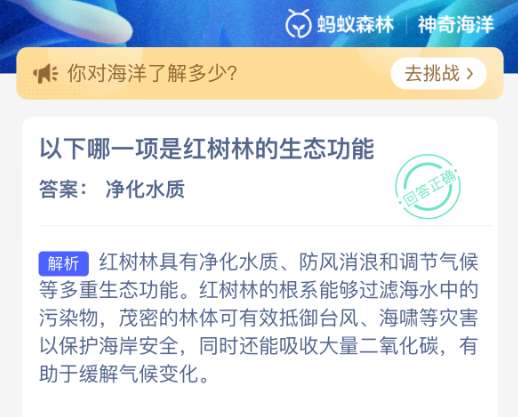 以下哪一项是红树林的生态功能?【神奇海洋】2026年1月30日新题目已开答!正确答案现已公布,点击领取拼图,一起为修复海洋生态贡献力量!今日正确答案是:【净化水质】。红树林具有净化水质、防风消浪和调节气候等多重生态功能。