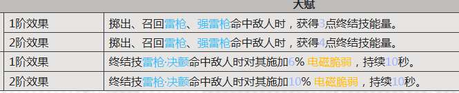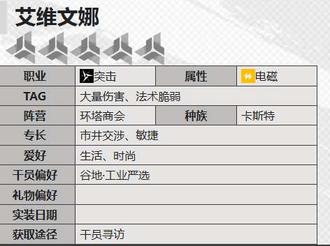 天赋系统给艾维文娜的战斗带来关键的辅助力。高效派送可以让雷枪命中敌人时,最多可以获得4点终结技能量,大幅度加快终结技能循环。委婉手段的电磁脆弱效果,不仅可以提升自身的伤害,还可以给辅助队友打出属性克制伤害。五阶潜能的检索,可以让干员的实力全面的提升,潜能一强化技能量获取,潜能2延长雷枪存续的时间,潜能三提升电磁伤害。