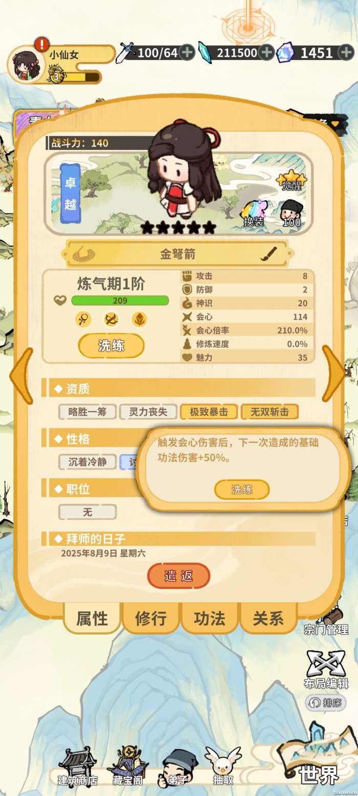 1. 灵力丧失的资质会出现在任何资质的弟子身上,挑选弟子不看出身,不看资质,只看有没1金1白的技能格就行,推荐从有自带“极致暴击”的弟子身上挑选即可,方便省事。