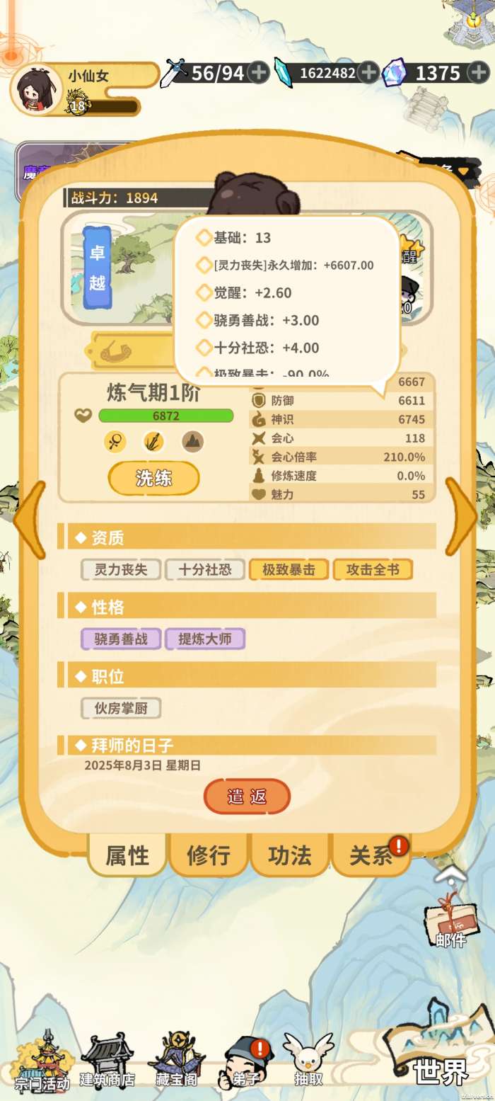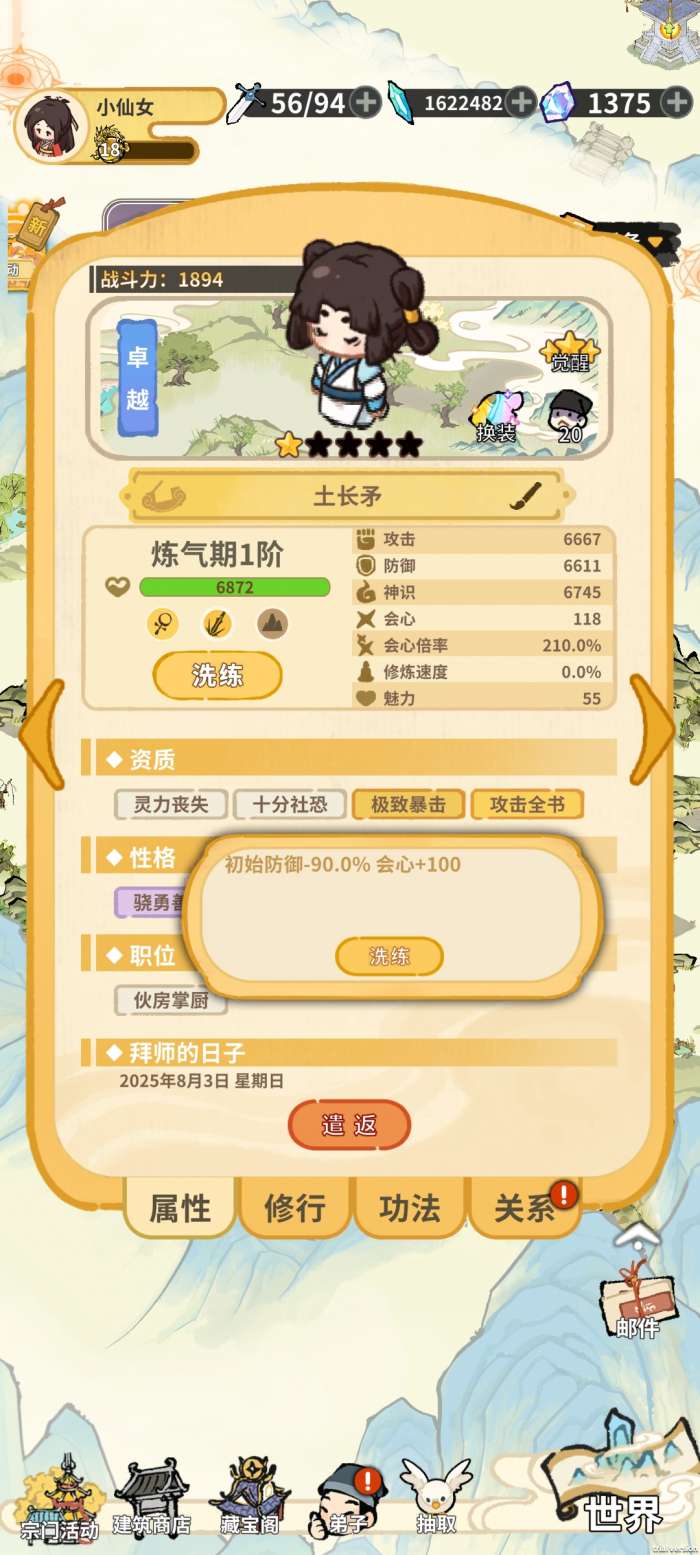 但是成长的属性也是有封顶的,每项属性50000,也正是因为这个词条的属性,我们才让这游戏有了挂机让其成长的意义,虽然大后期输出比不上那些培养出来的极限输出的弟子有10万的单一属性,但是他们脆皮,甚至防御是负的。丧失弟子的能力却是因为概率平等关系,得到的四维(生命、攻击、防御、神识)会无限接近于相同。