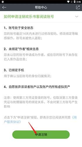3、点击“如何申请注销欢乐书客阅读账号”选项。