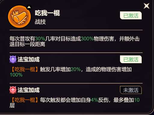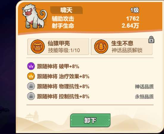 仙猿甲壳:进入战斗后获得一个仙猿甲壳,降低自身30%伤害结果,同时增加10%物理抗性与10%魔法抗性,效果持续到战斗结策