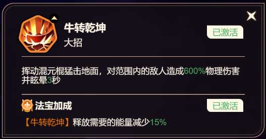 挥动混元棍猛击地面,对范围内的敌人造成600%物理伤害并眩晕3秒