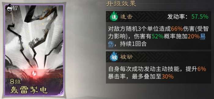 追击技能固定携带【轰雷掣电】,对敌方随机3个单位造成伤害,并有52%概率施加20%易伤,提升队伍的输出能力。