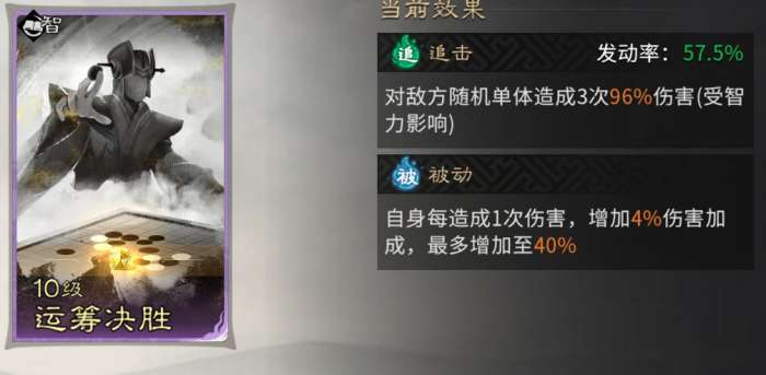 被动技能固定携带【运筹决胜】,自身每造成1次伤害,增加4%伤害加成,至多增加40%。
