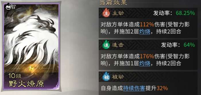 主动技能固定携带【野火燎原】,对敌方单体造成伤害并施加2层灼烧。