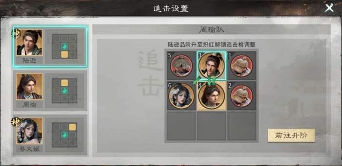 英雄站位:蔡文姬不站追击格,陆逊站蔡文姬的追击格,并与周瑜互站追击格。