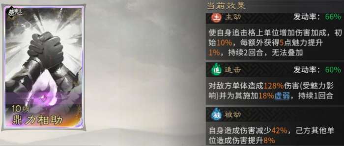 主动与被动技能均固定携带【鼎力相助】,作为主动技能时,可定向提升己方追击格英雄的伤害;作为被动技能时,则会降低自身造成的伤害,同时提高友方单位的伤害。蔡文姬为辅助位,输出能力有限,因此这个负面效果影响不大。