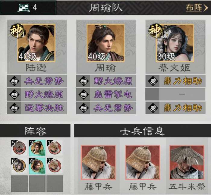 兵种站位:在蔡文姬的上方放置一个五斗米祭;在陆逊和周瑜的前方,各放置一个藤甲兵。