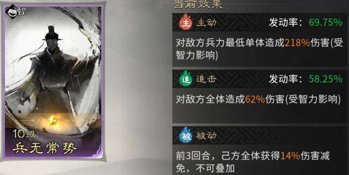 主动技能固定携带【兵无常势】,对敌方兵力至低单体造成高额伤害,收割敌方残血,使敌方快速减员。