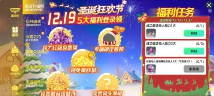圣诞盛典将会带来5大福利,第一个就是从12月19日到12月25日,玩家能连续领取7天圣诞超大红包,没有什么任务需要完成只要登录,就可以开红包拿奖励,成功邀请好友进行助力,还能收获更多奖励,最高玩家能开出99把。