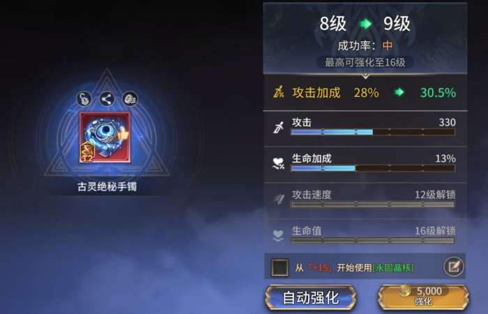前期金币产出有限,没必要每件装备都强化到+16,才去挑选适用的装备。我们要先确定这件装备词条是否符合需求,其次可以先+8,看一下副词条的强化进度,如果+8全蓝色可以不用继续强化到+16。一般来说符合需求的词条达到紫色,就是优质字条。初期单装备2条优质词条即可,后期慢慢的追求3条(如果有金色攻击、暴击伤害词条,更好)。