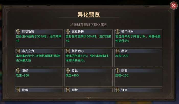 T1:嚣张(攻击+200~400)、迅猛(+2%攻击、攻击速度10)、不动之物(+5%防御,与不挡之力有联动)、野性(2%暴击、暴伤)、灾厄不息(对控制敌人伤害+5%)、唤灵师(+8%召唤物伤害)、背水一战(提高攻速)、恩泽(奶妈通用,提高怒气恢复、治疗效果)、惊天巨浪(额外AOE输出、降低防御)、诅咒之触(减速增伤3-4%)T2:强韧(生命值+600~1200)、掌柜包办(+2%伤害)、赐福祈祷(提升治疗效果)、暴食赐福(提高生命值)、堡垒(2%防御/生命值)T3:其他异化