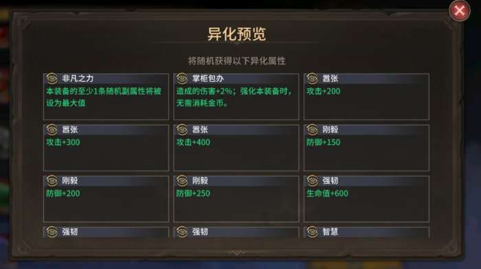 每件装备都有基础的主词条、副词条,通过强化可提高主词条、副词条加成。强化提高的主词条幅度相同,而副词条强化进度随机(词条颜色红>金>紫>蓝),也就是说我们一件装备强化到16级,装备的强化练度均有不同。红色词条只存在于异化装备,词条“非凡之力”可将一件装备的至少一条随机属性设置为最大值。