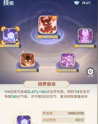 阎罗追命:这就属于一个群攻类型的技能,主要的亮点是可以有效复活队友。在团队战争时,如果战局逐渐进入到僵硬化,那此时就可以迅速的弥补团队战斗的缺口。可以在短时间内扭转战局。