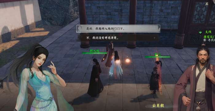 绝剑门招收弟子极为严格,玩家需要完成一系列前置宣导任务后才能获得加入门派的机会。首先如果直接前往绝剑门要求加入会遭到拒绝,必须先触发机遇事件才能获得机会,这里从绝剑门的弟子交互和附近村落中的NPC对话中,玩家能了解到部分绝剑门弟子遭到危难受困。此时前往任务区域即可解锁战斗任务,击败来袭的敌人后可以获得这些弟子的感激,然后告知目的获得门派推荐信,再回到绝剑门的宣导处就能依靠推荐信成功加入到门派中。