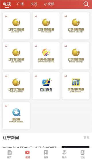 2、进入“视听”页面,这样就可以收看收听辽宁广播电视台的所有电视频道和广播频率的节目了。