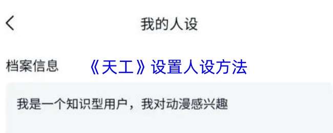 3、输入档案信息和搜索用途:在“我的人设”页面中,根据提示输入您的档案信息(如姓名、年龄、职业等)和搜索用途(如学习、工作、娱乐等)。这些信息将帮助天工更好地理解您的需求,从而提供更个性化的搜索结果。
