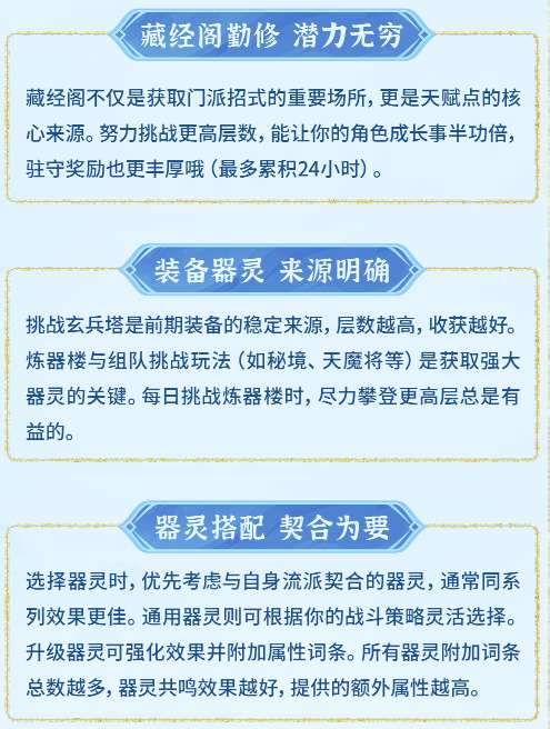 师门悬赏(基础资源)、玄兵塔(装备核心来源)、炼器楼(高层器灵更优)、挑战玩法(首通有礼活动额外奖励),稳定积累经验、物资与修炼资源,细水长流方为长久之计。